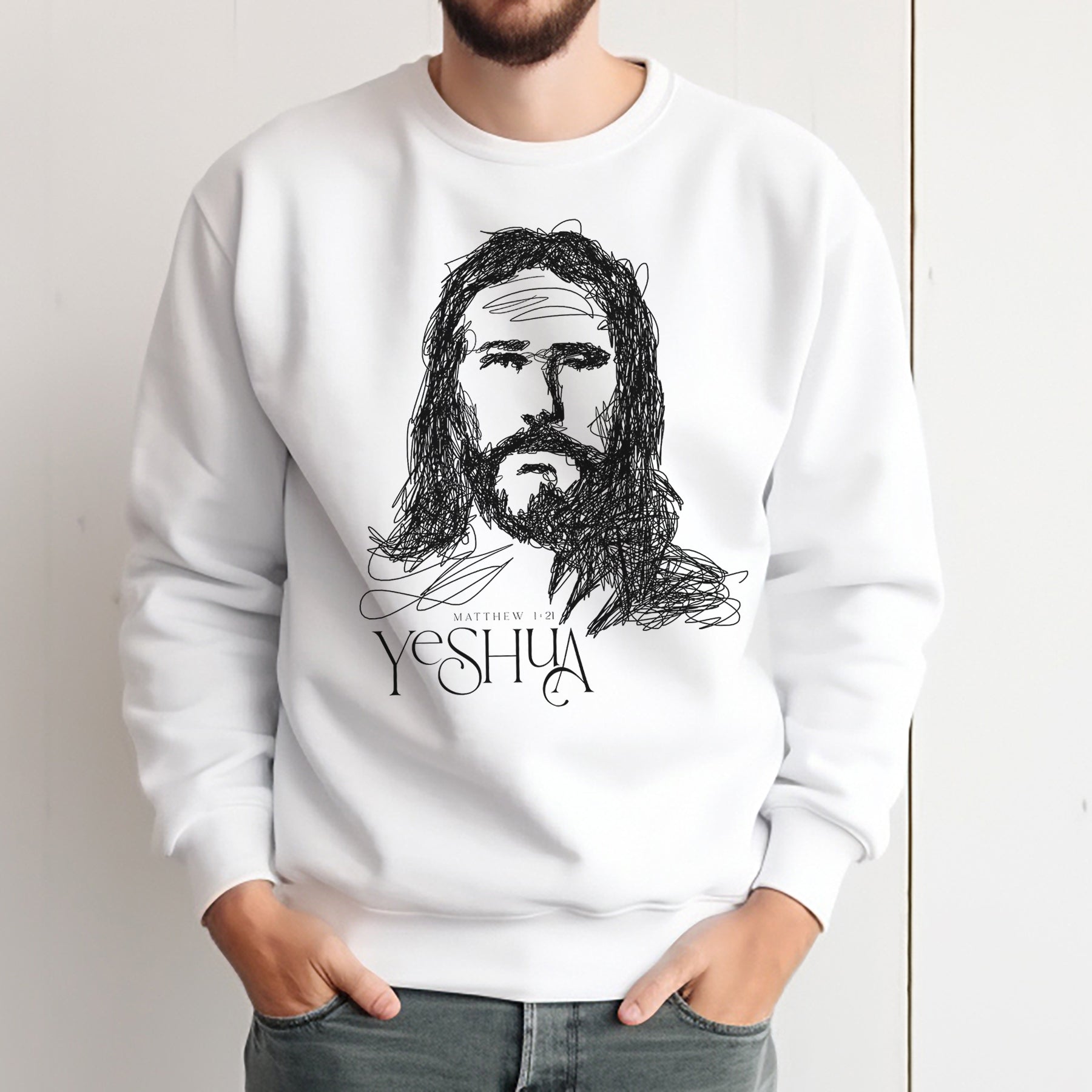 Introducing our Matthew 1:21 scripture "YESHUA" Christian men's & women's unisex sweatshirt, featuring the face of Jesus portrait in a scribble style drawing design. Super soft and comfortable, choose from 3 trendy colors to match your vibe. What a great way to share the message of salvation and love of God! Makes a meaningful gift for the worshiper, prayer warrior, and spirit-filled believer in your life!