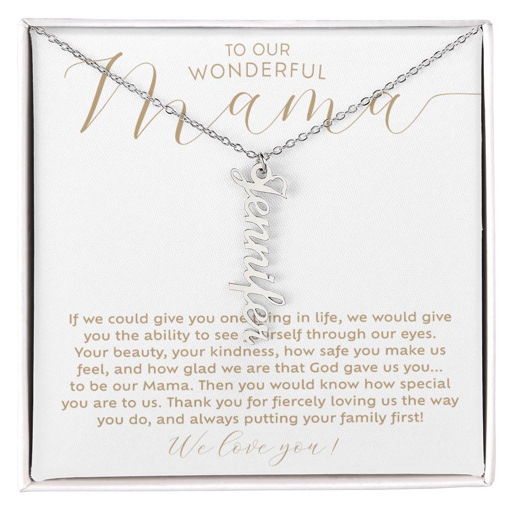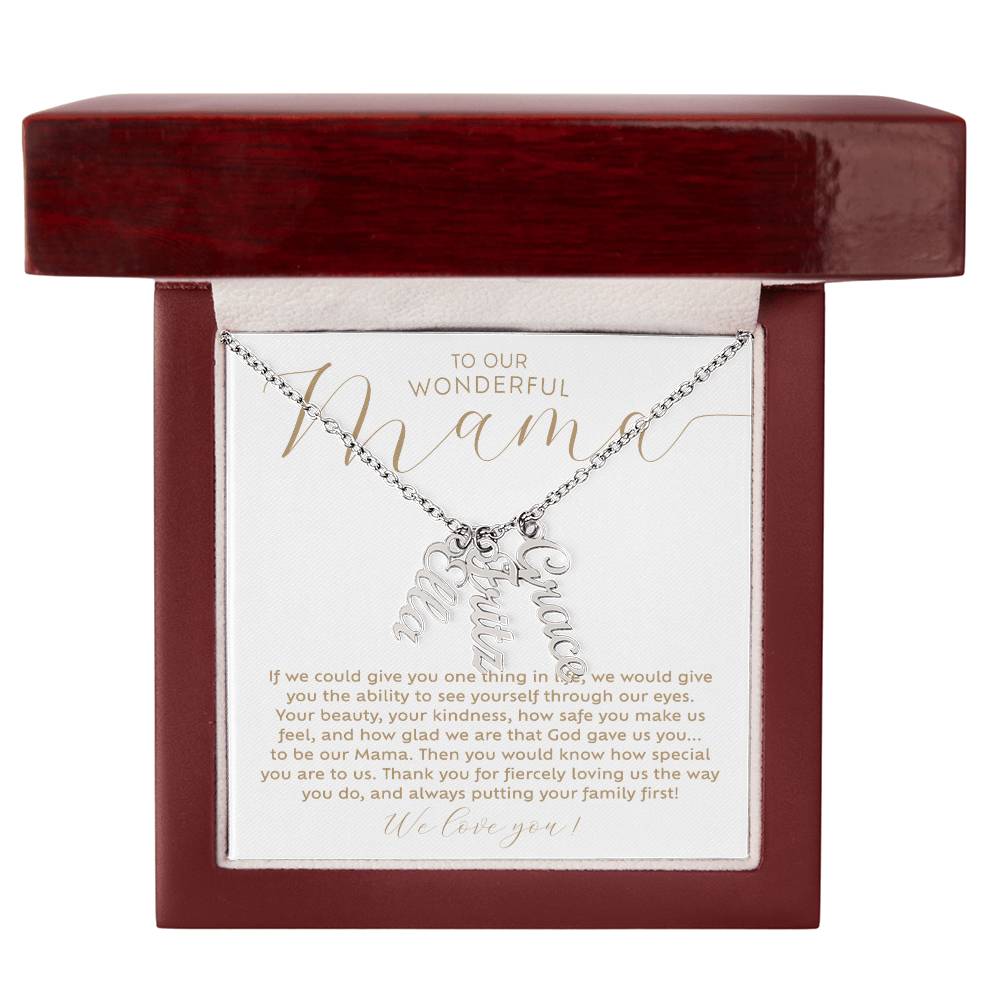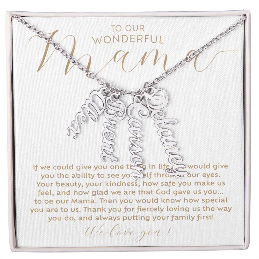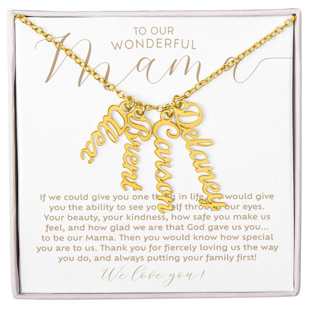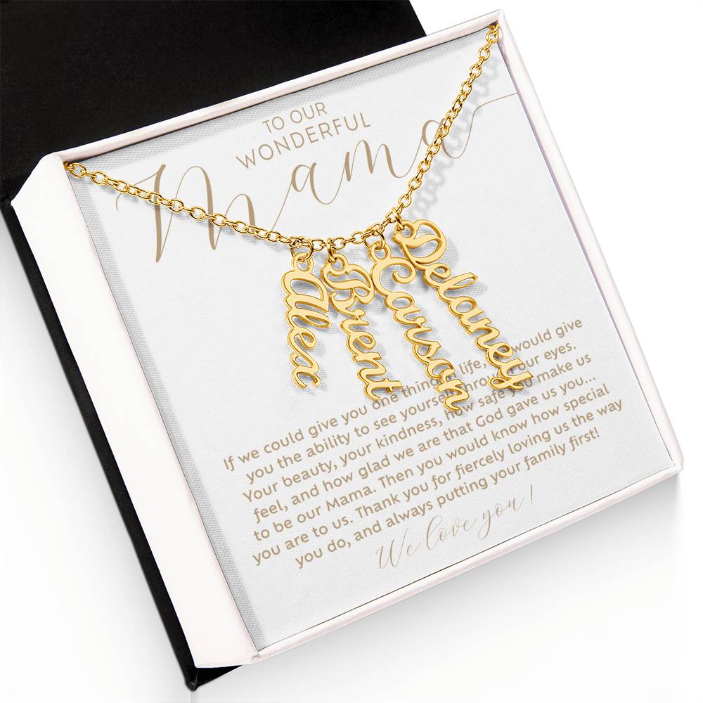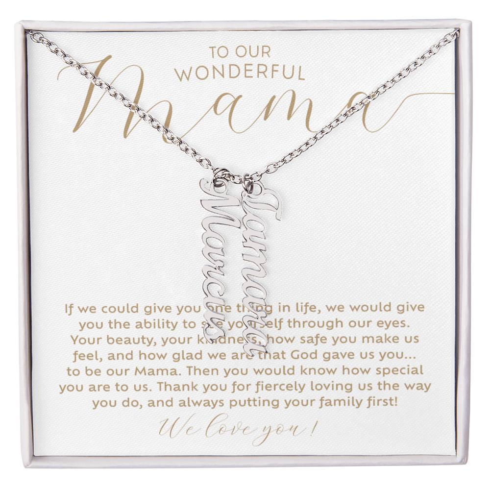 Give your wonderful Mama a custom vertical necklace with her kid's names made just for her! Our Personalized Vertical Multi-Name Necklace is the perfect gift for the treasured Moms in your life, and will become a go-to accessory for any occasion. From a heart-warming holiday Christmas present, anniversary, birthday, Mother's Day gift, or just because she is so special, this unique necklace adds a trendy touch to any outfit.