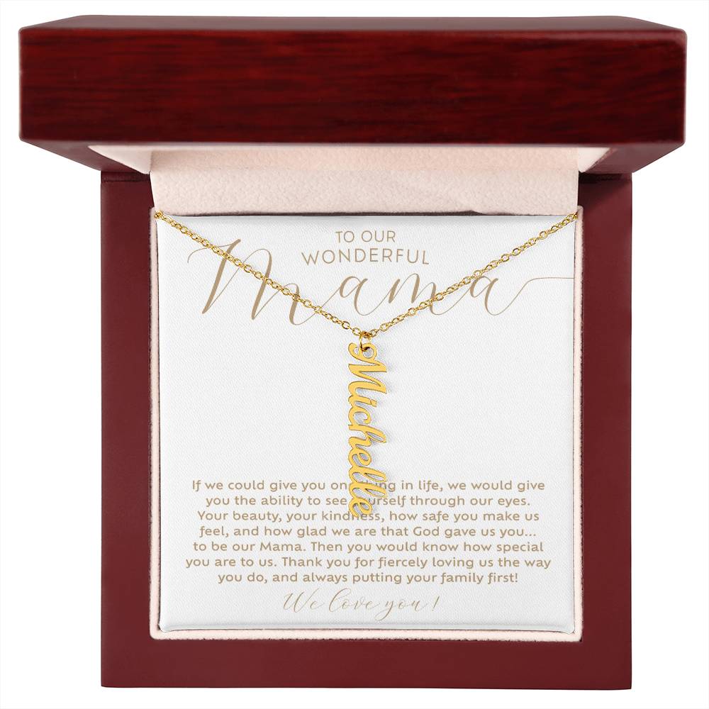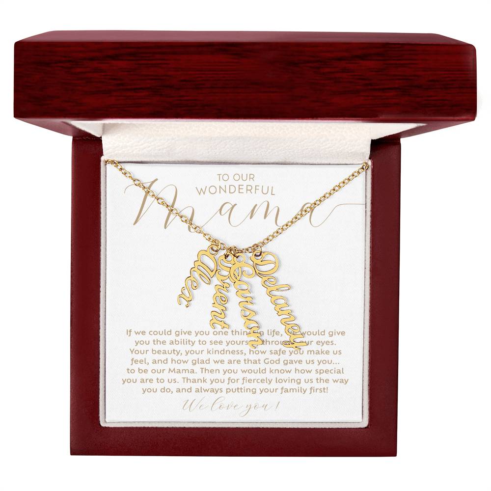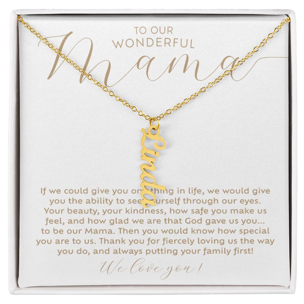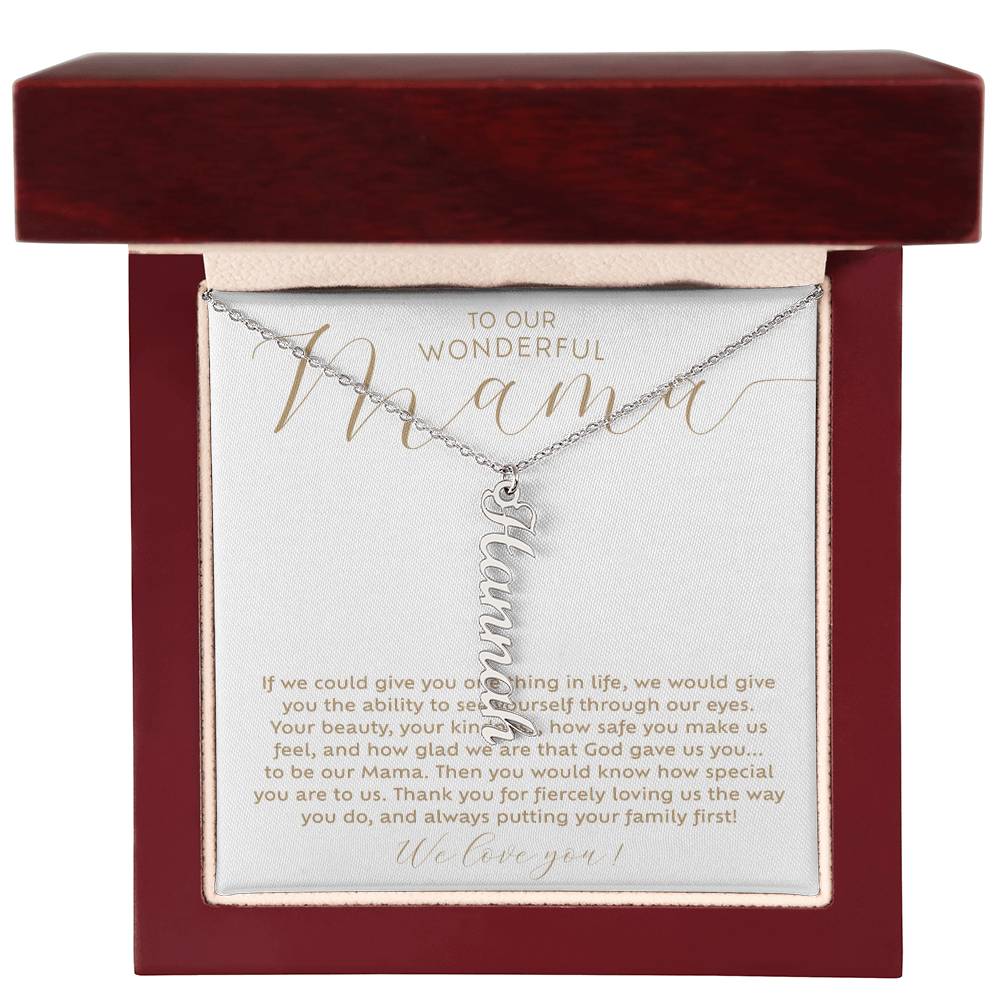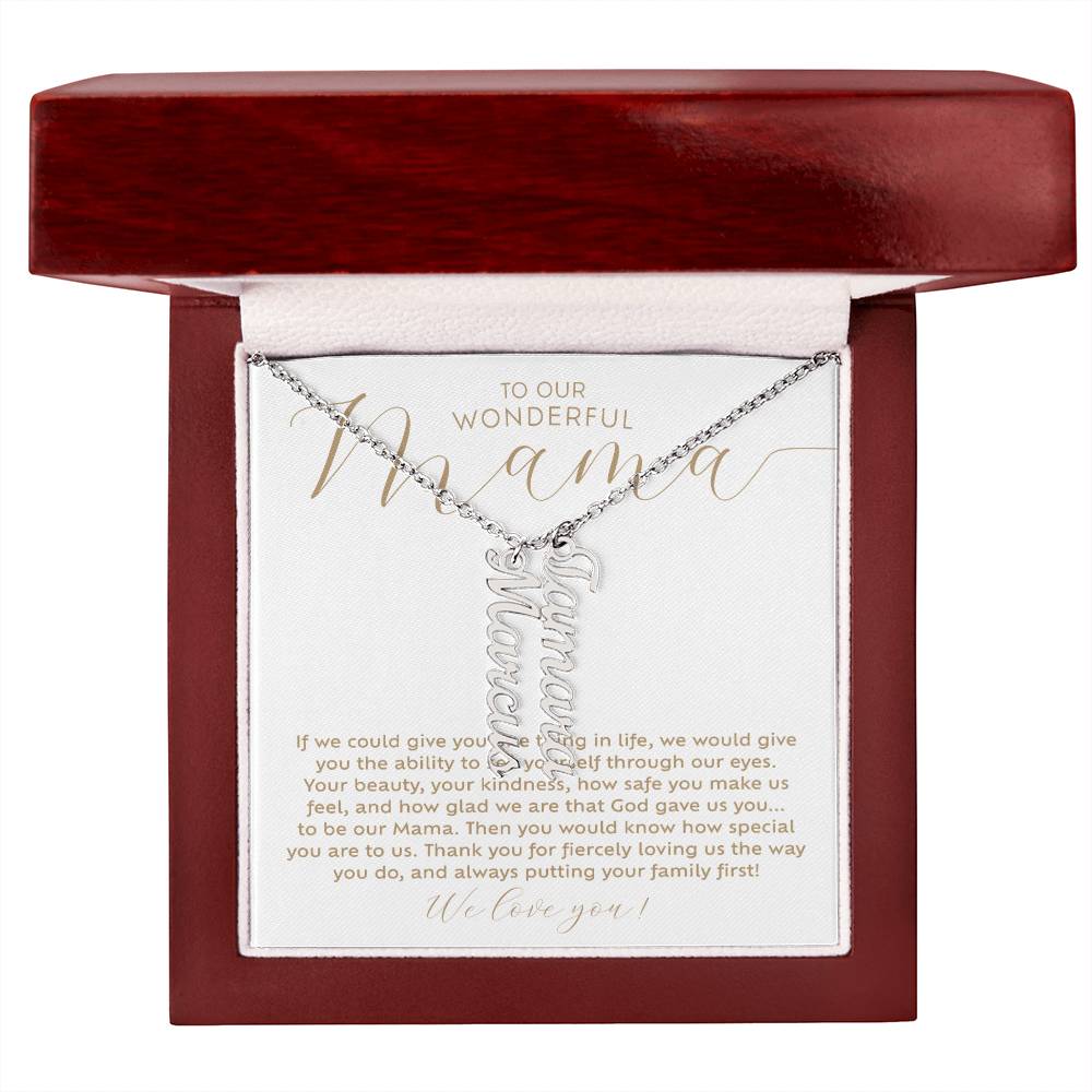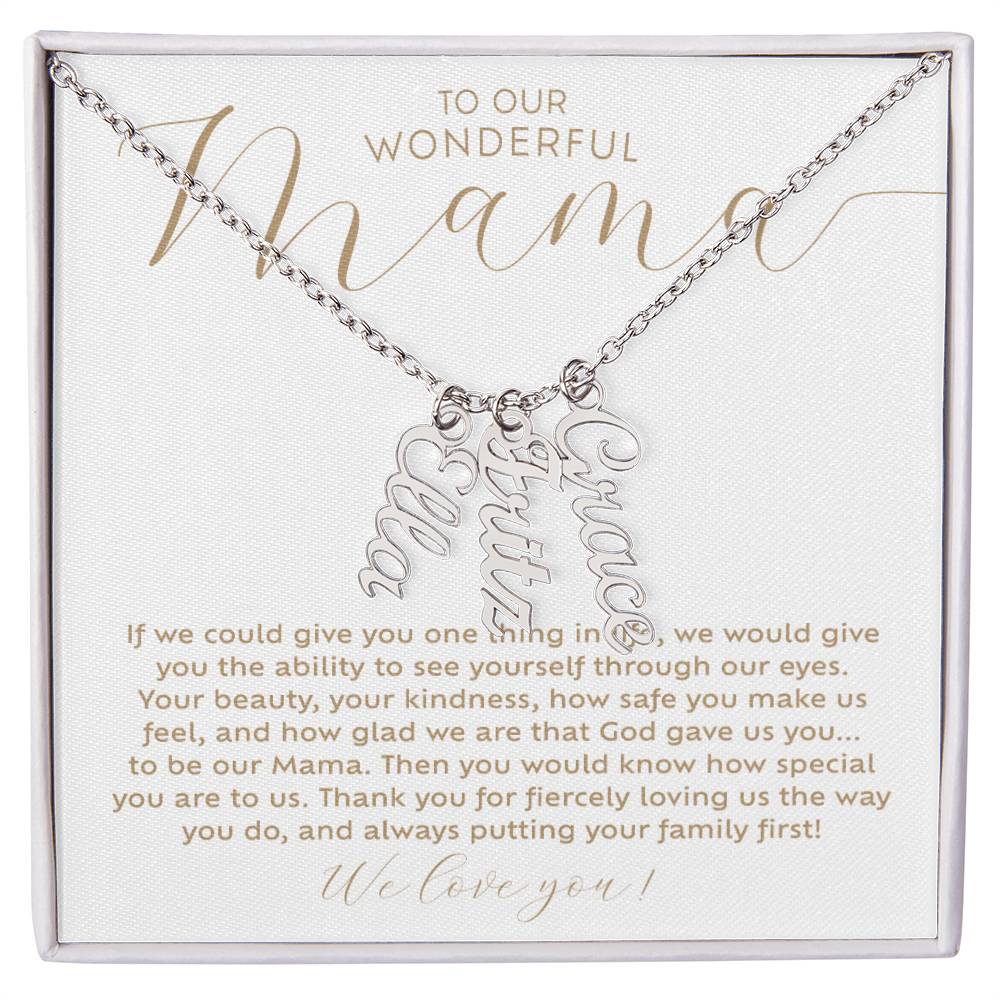 Give your wonderful Mama a custom vertical necklace with her kid's names made just for her! Our Personalized Vertical Multi-Name Necklace is the perfect gift for the treasured Moms in your life, and will become a go-to accessory for any occasion. From a heart-warming holiday Christmas present, anniversary, birthday, Mother's Day gift, or just because she is so special, this unique necklace adds a trendy touch to any outfit.