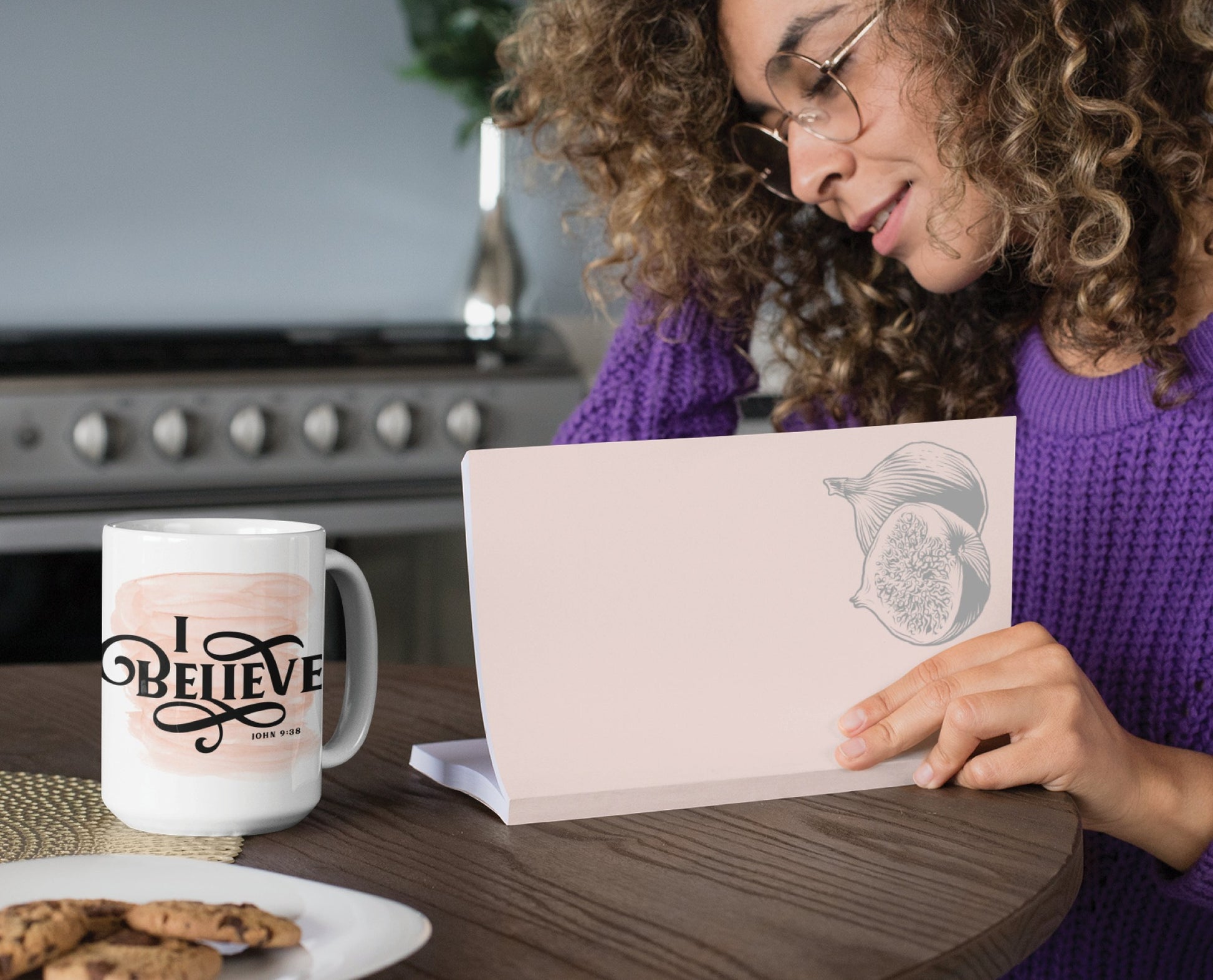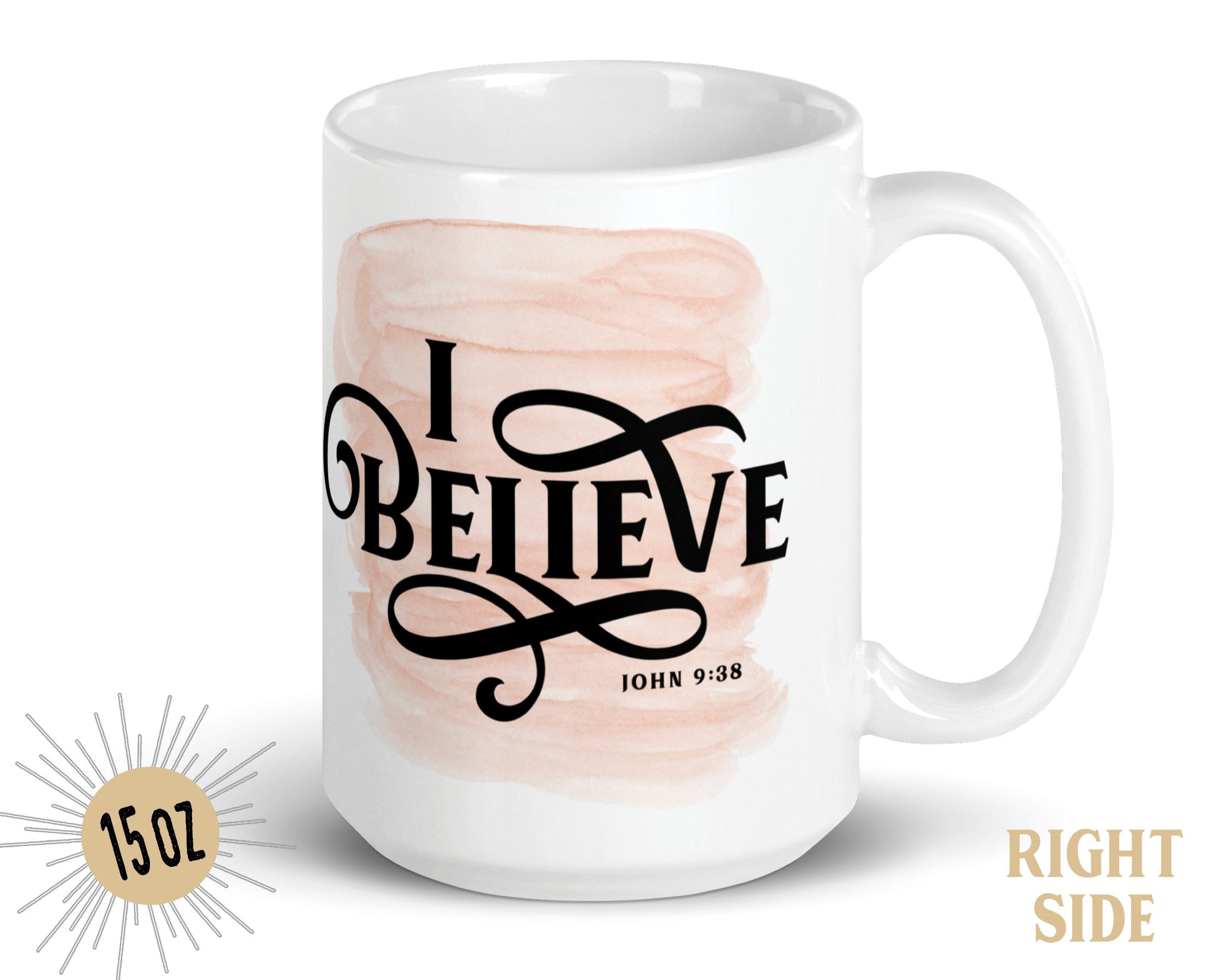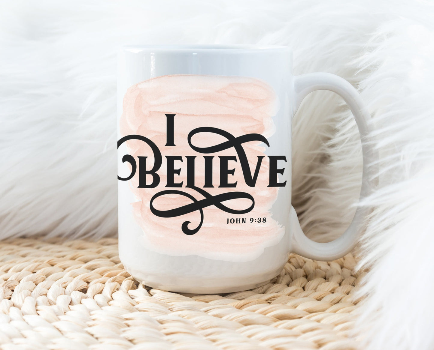 This lovingly designed swirl I Believe white ceramic mug with peachy pink watercolor splash background is a great way to express your faith and share your story with those around you, and is also a perfect gift for the faith-filled Jesus believer in your life!!