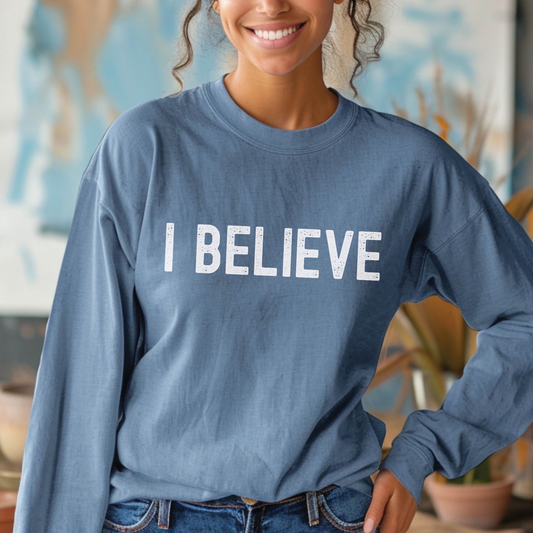 This bold faith statement I BELIEVE Christian men's & women's unisex crewneck long sleeve t-shirt, with a simple distressed typography print is a great way to share your testimony, and is also a perfect gift for the faith-filled Jesus believer in your life!!