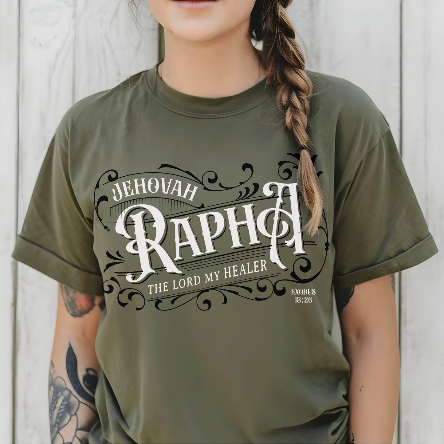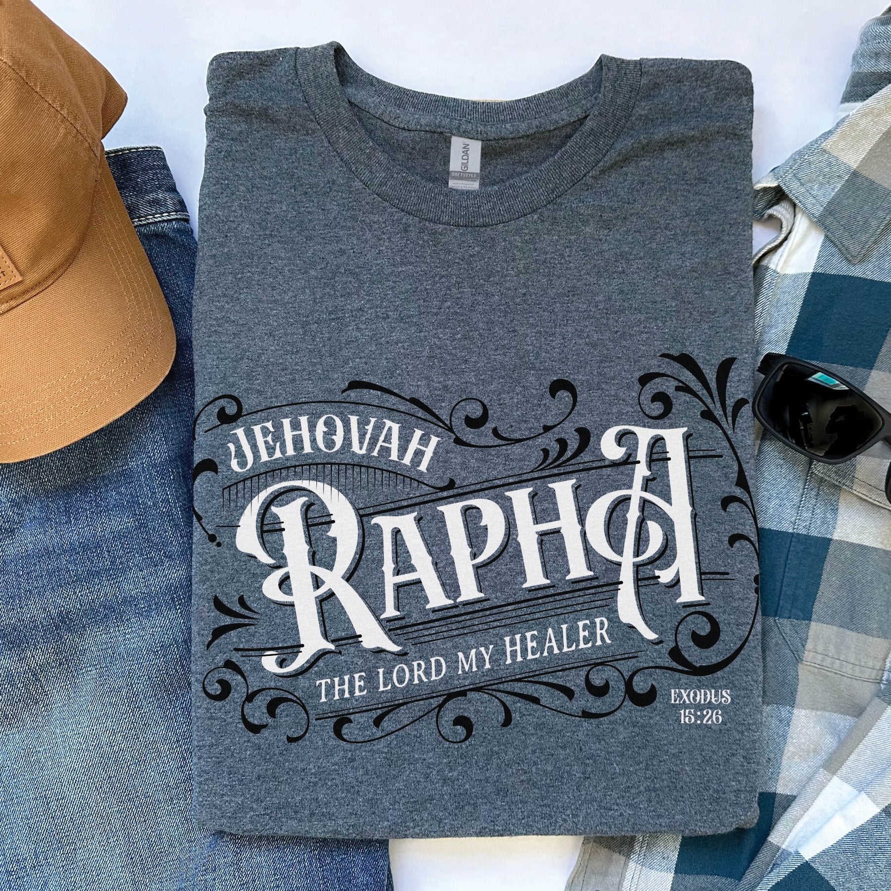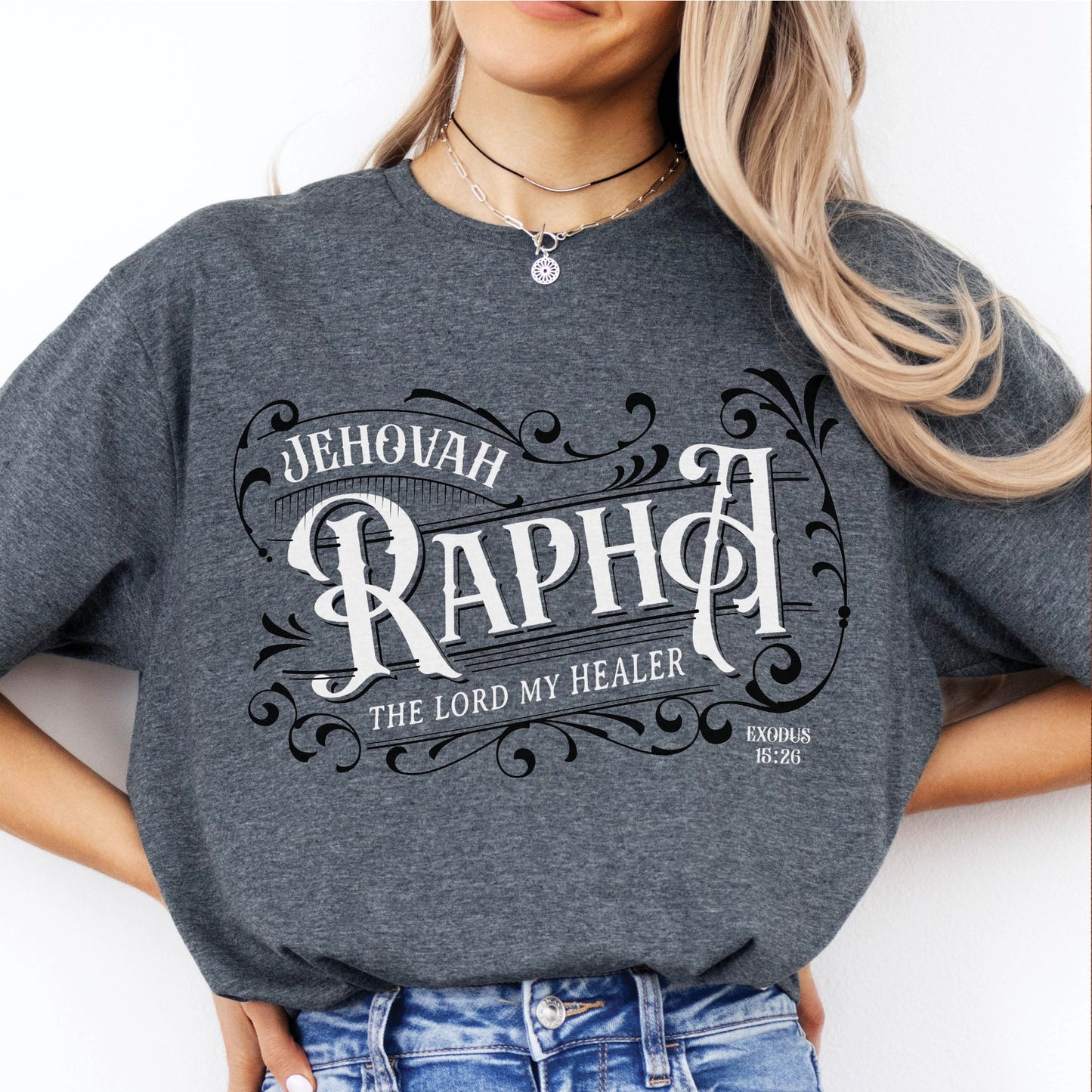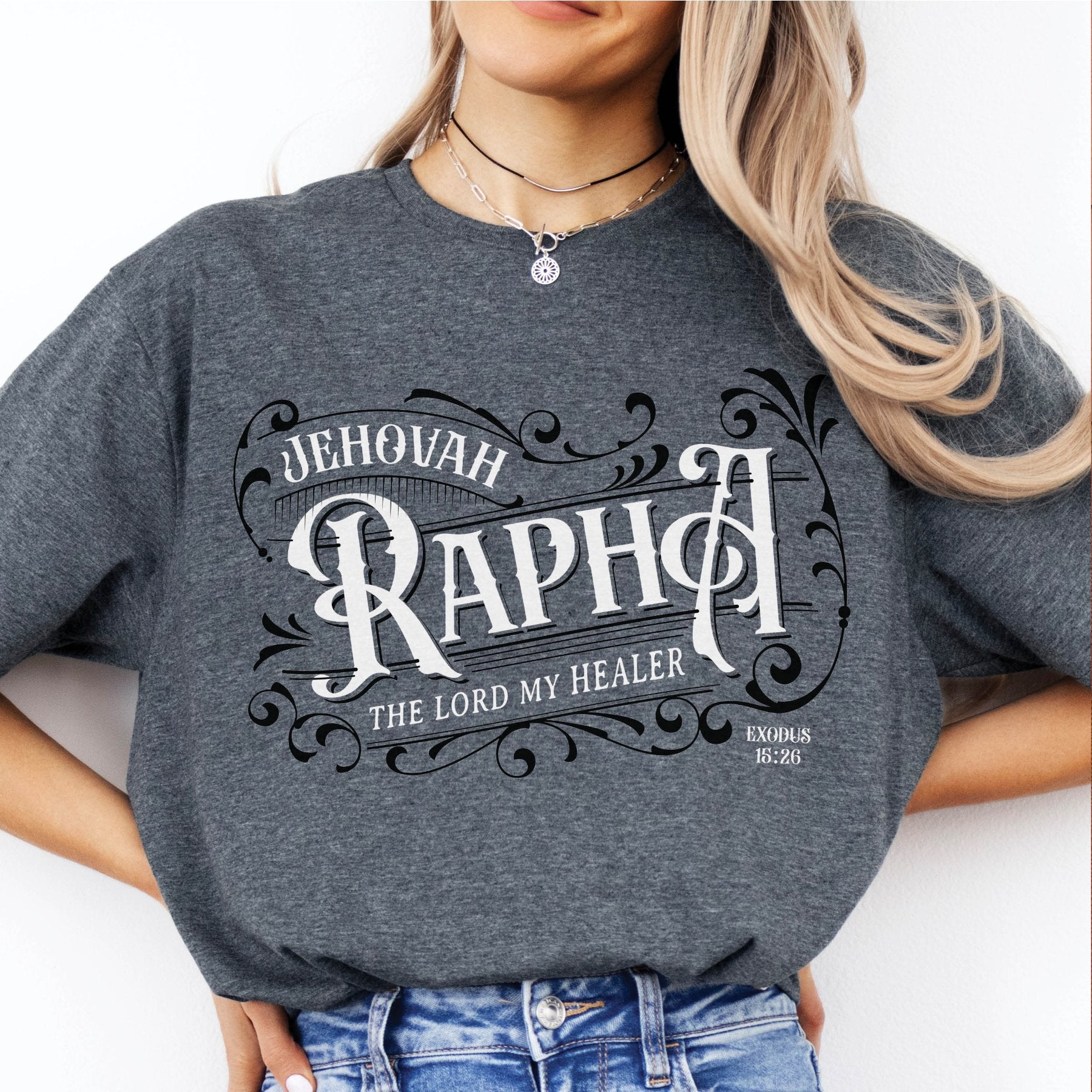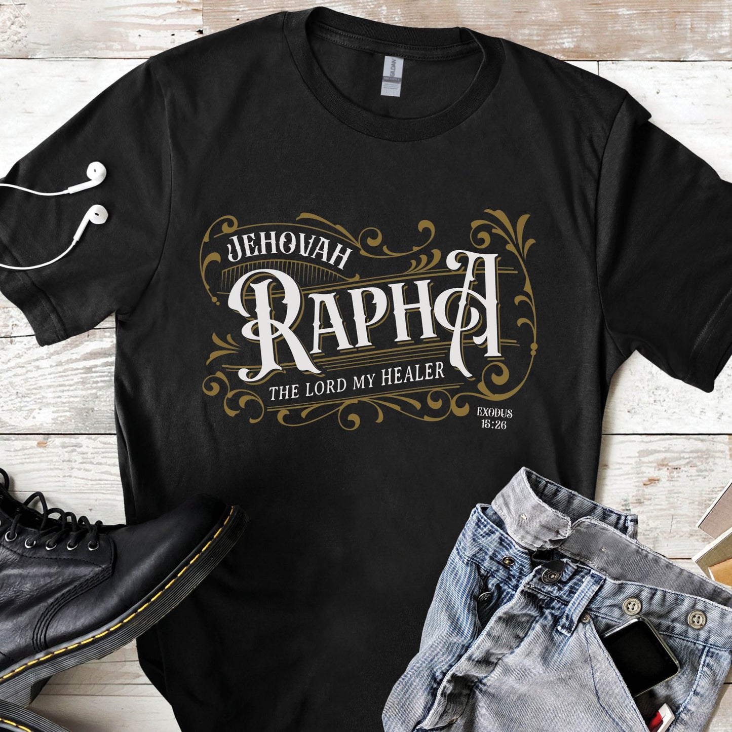 This soft and comfortable JEHOVAH RAPHA unisex t-shirt, with the transliteration of the Hebrew meaning of one of the amazing Names of God "The Lord My Healer", is inspired by the Exodus 15:26 bible verse that reminds us of His ever-present, never-failing, always-faithful power to heal in your life. Featuring an ornate vintage blackletter design in gold & white / black & white - it's the perfect conversation starter to share your testimony. Makes a great gift for the faith-filled believer in your life!