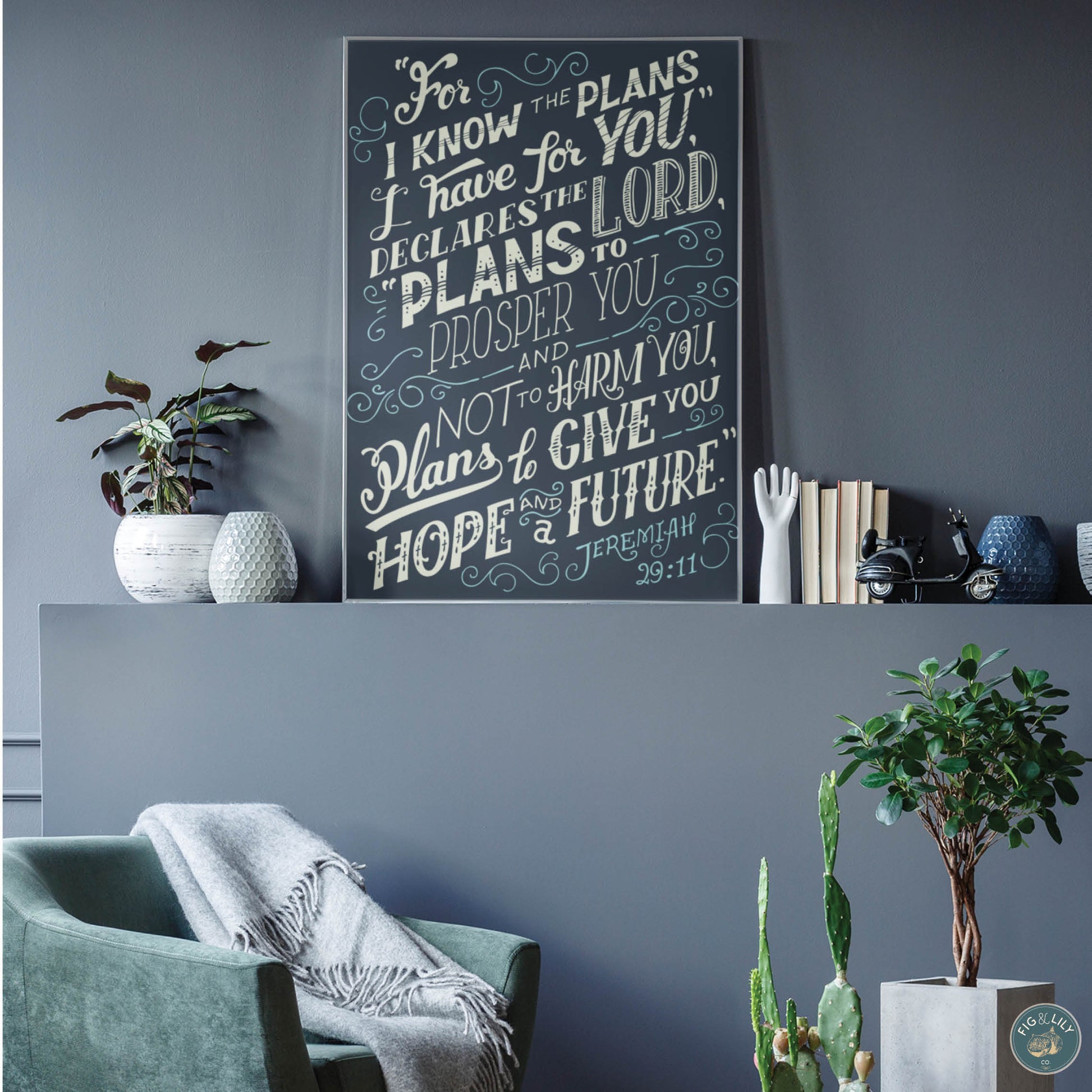 This Jeremiah 29:11 wall art canvas is a perfect way to bring faith-based inspiration into any home or office. Made from sturdy wood stretchers, 1.5" thick canvas, and high quality printing, this artwork is durable and guaranteed to last, allowing for an everlasting reminder of this famous Bible verse. Featuring bold cream and light teal lettering on a gorgeous, moody, rich navy blue background, this unique canvas is an eye-catching and timeless piece of Christian décor.