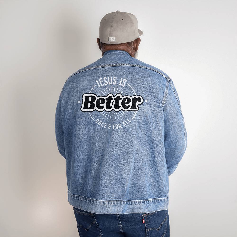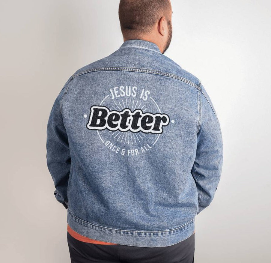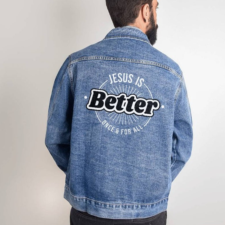 Our custom-designed "Jesus Is Better - Once & For All" Christian Retro Logo Style Men's Denim Jacket is the perfect way wear and share your faith with those around you This jean jacket, based on the one of our favorite book of the bible - Hebrews - will elevate your classic look without compromising on warmth & comfort - order your faith statement jacket today!