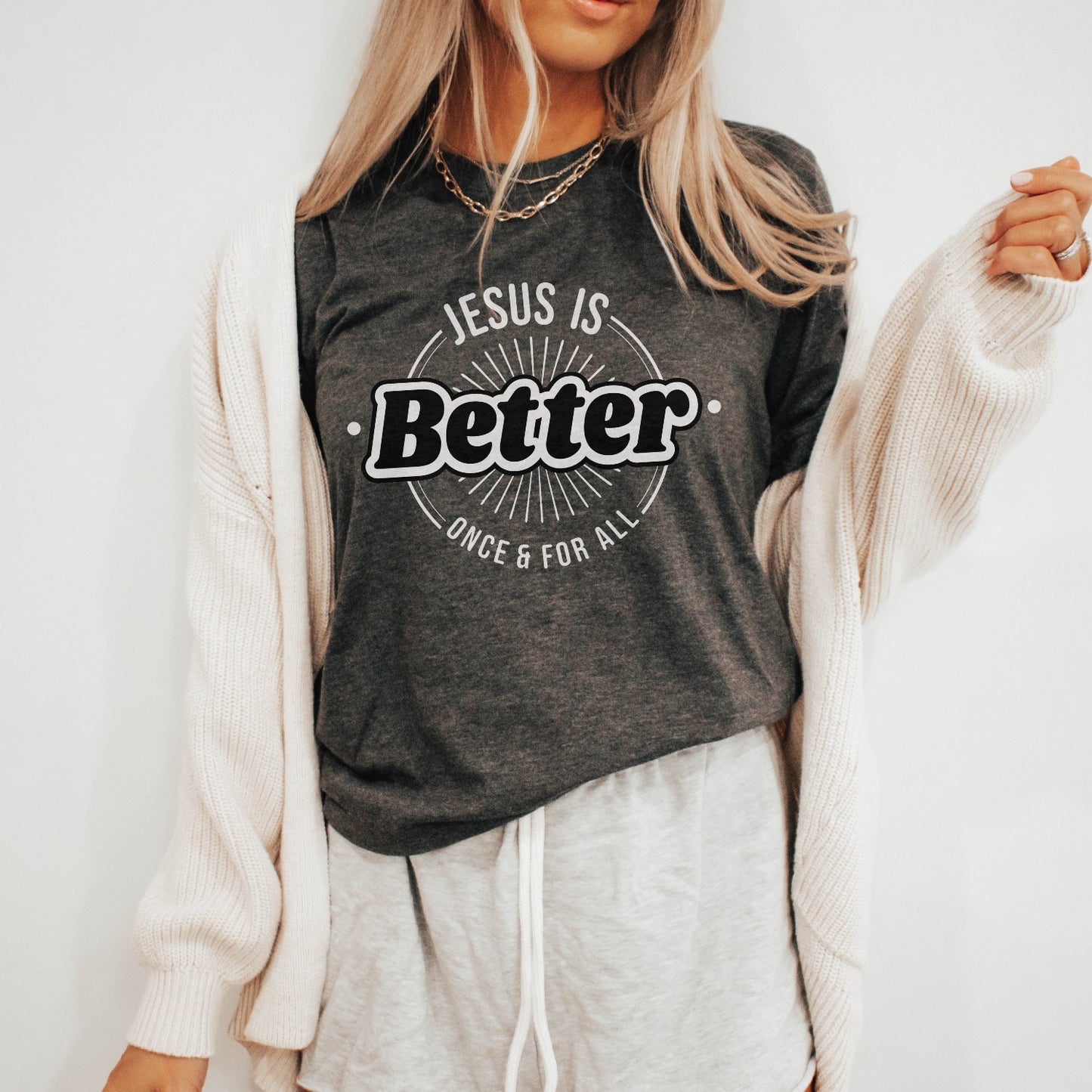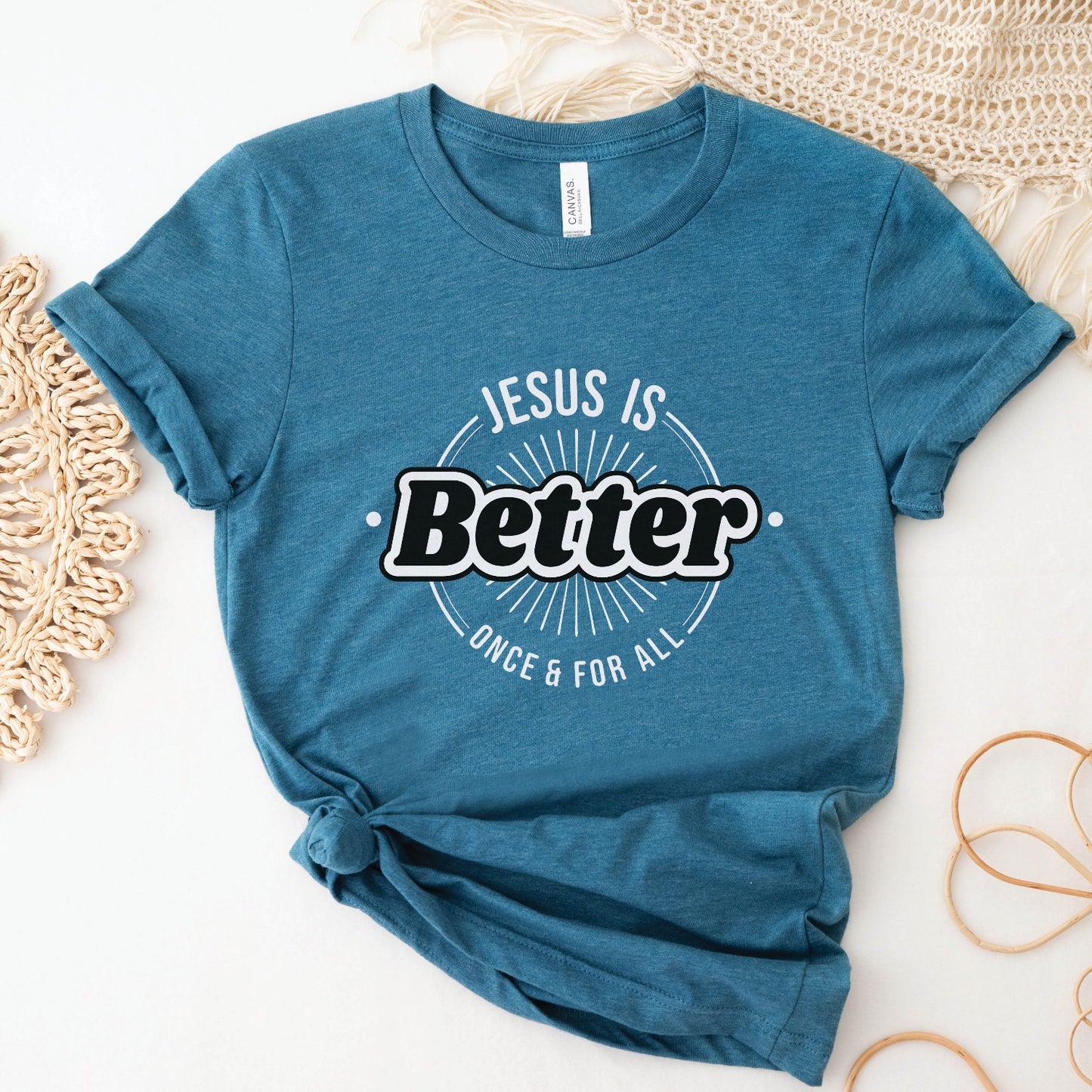 Introducing our faith-based statement "Jesus Is BETTER - Once & For All" women's unisex Christian t-shirt, the best 100% cotton tee you're ever tried, featuring a bold sunburst logo style design. Made in the USA with premium quality super soft and comfortable Bella Canvas 3001 tee - choose from 7 trendy colors to match your vibe. What a great way to share the message of the new life covenant through Jesus - He willingly did it ONCE and for ALL! Also makes a perfect gift for the worshiper, prayer warrior, and spirit-filled believer in your life!