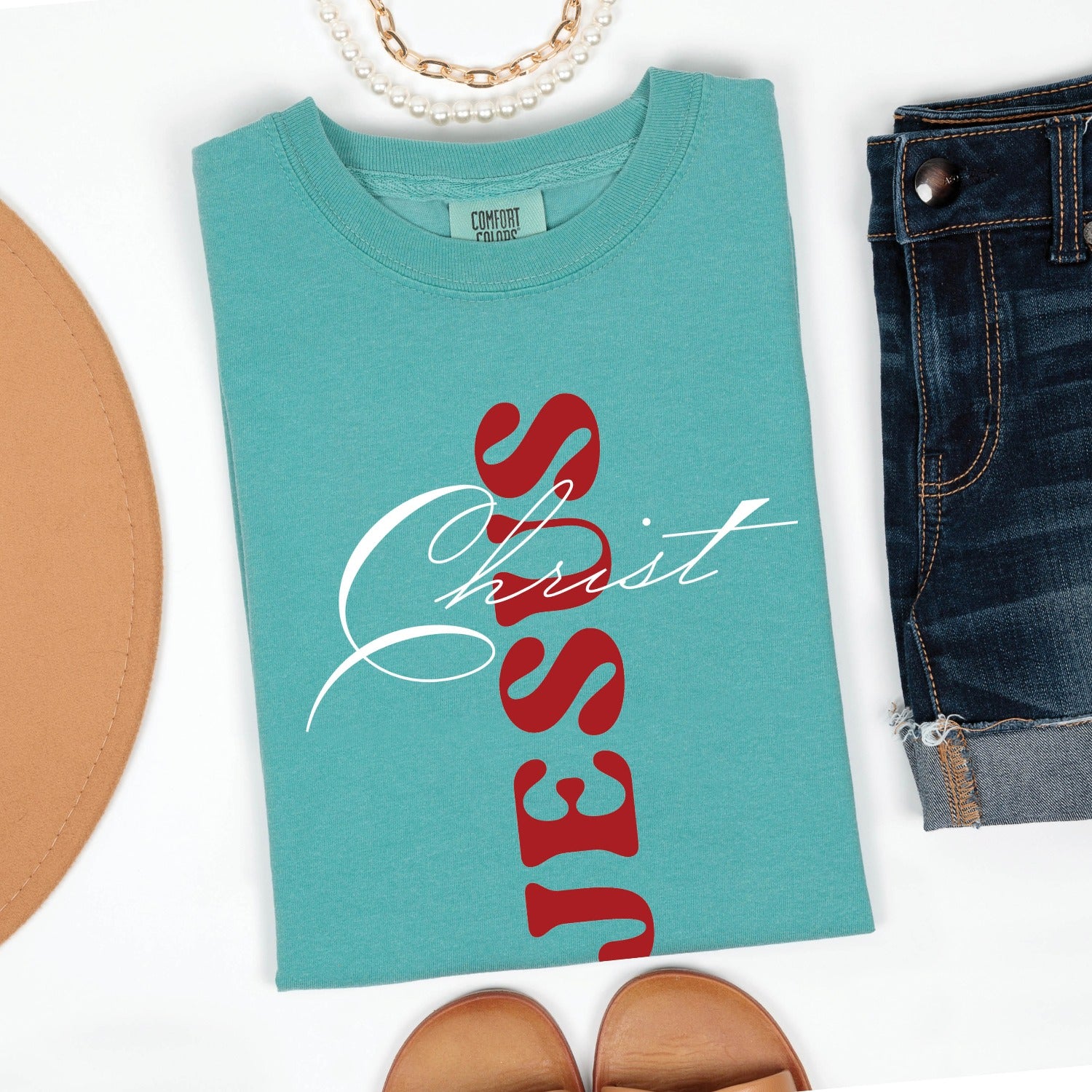 Elevate your Christian t-shirt collection with this unisex Comfort Colors C1717 heavyweight t-shirt, featuring our "Jesus Christ" bold typography Cross design, perfect for women and men. Crafted for comfort in 100% ring-spun cotton, this garment-dyed structured tee is super soft and breathable. Size up a few for a super trendy look, and choose from 7 fun colors to match your vibe. What a great way to share the message of the cross and the life of freedom we have in God through Jesus - He willingly did it ONCE and for ALL! Makes a perfect gift for the worshipper, prayer warrior, and spirit-filled believer in your life!
