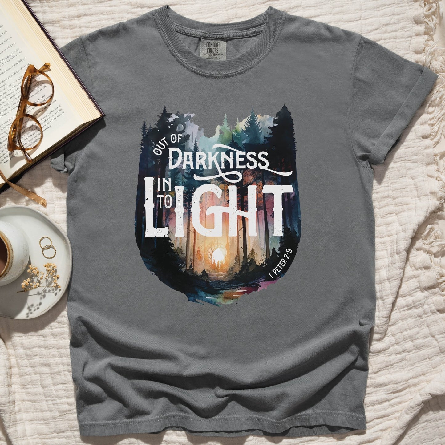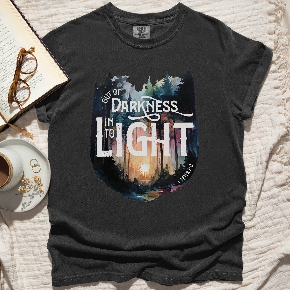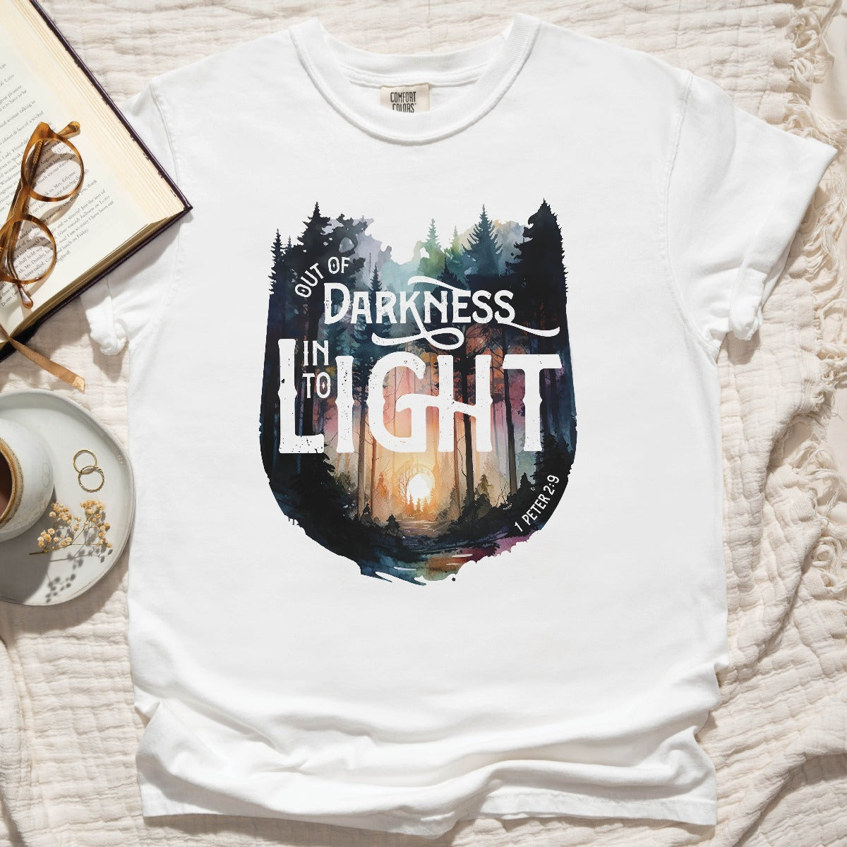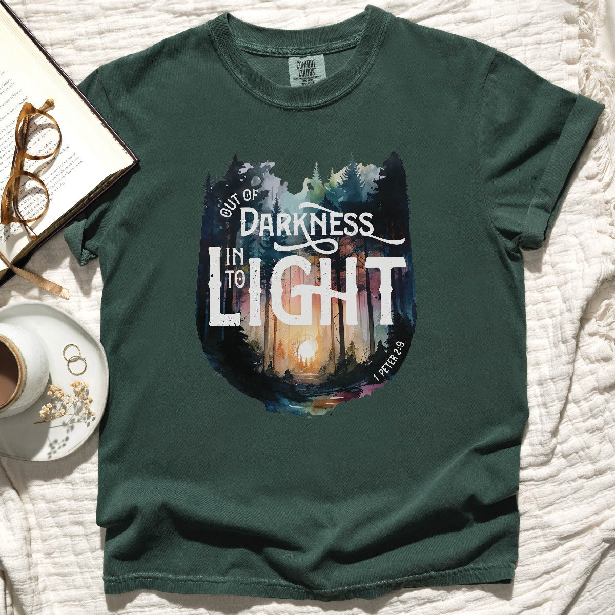 Elevate your Christian t-shirt collection with our unisex men's and women's Comfort Colors C1717 T-Shirt, featuring a watercolor forest design and the inspiring bible verse message "Out of Darkness, Into the Light - 1 Peter 2:9". Crafted for comfort in 100% ring-spun cotton, this heavyweight structured tee is super soft and breathable - choose from a range of trendy colors to suit your style. Wear your faith and effortlessly start a conversation that changes lives in this inspirational tee. Perfect thoughtful and meaningful gift for the faith-filled Jesus believer in your life. Let your light shine!