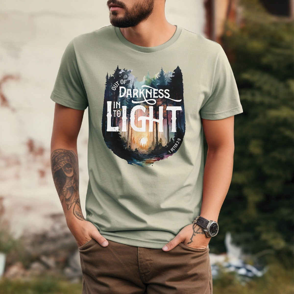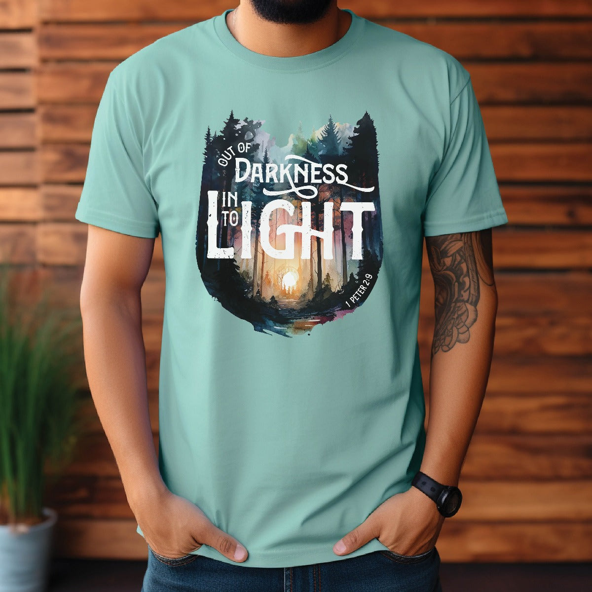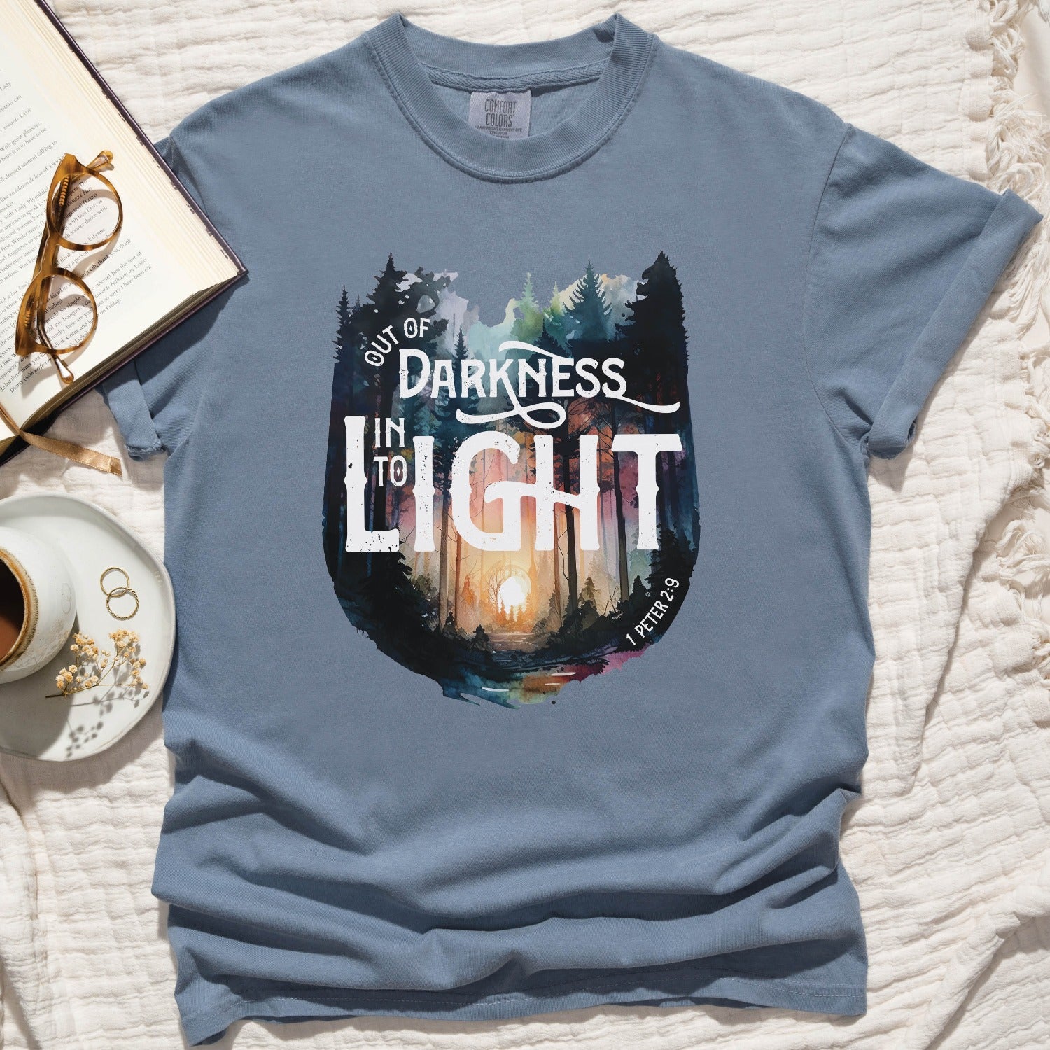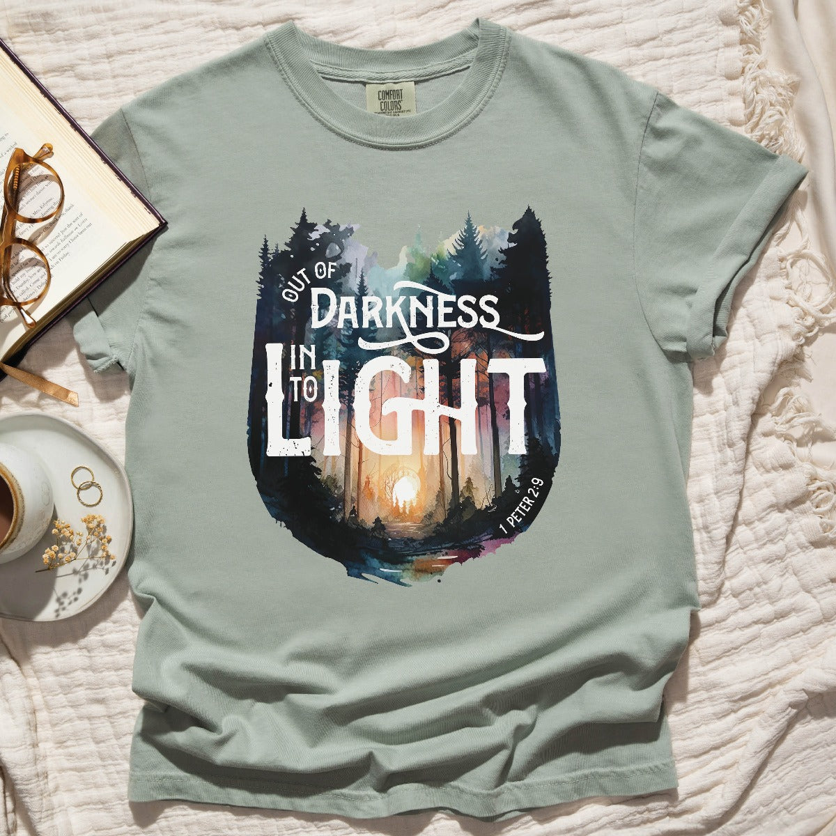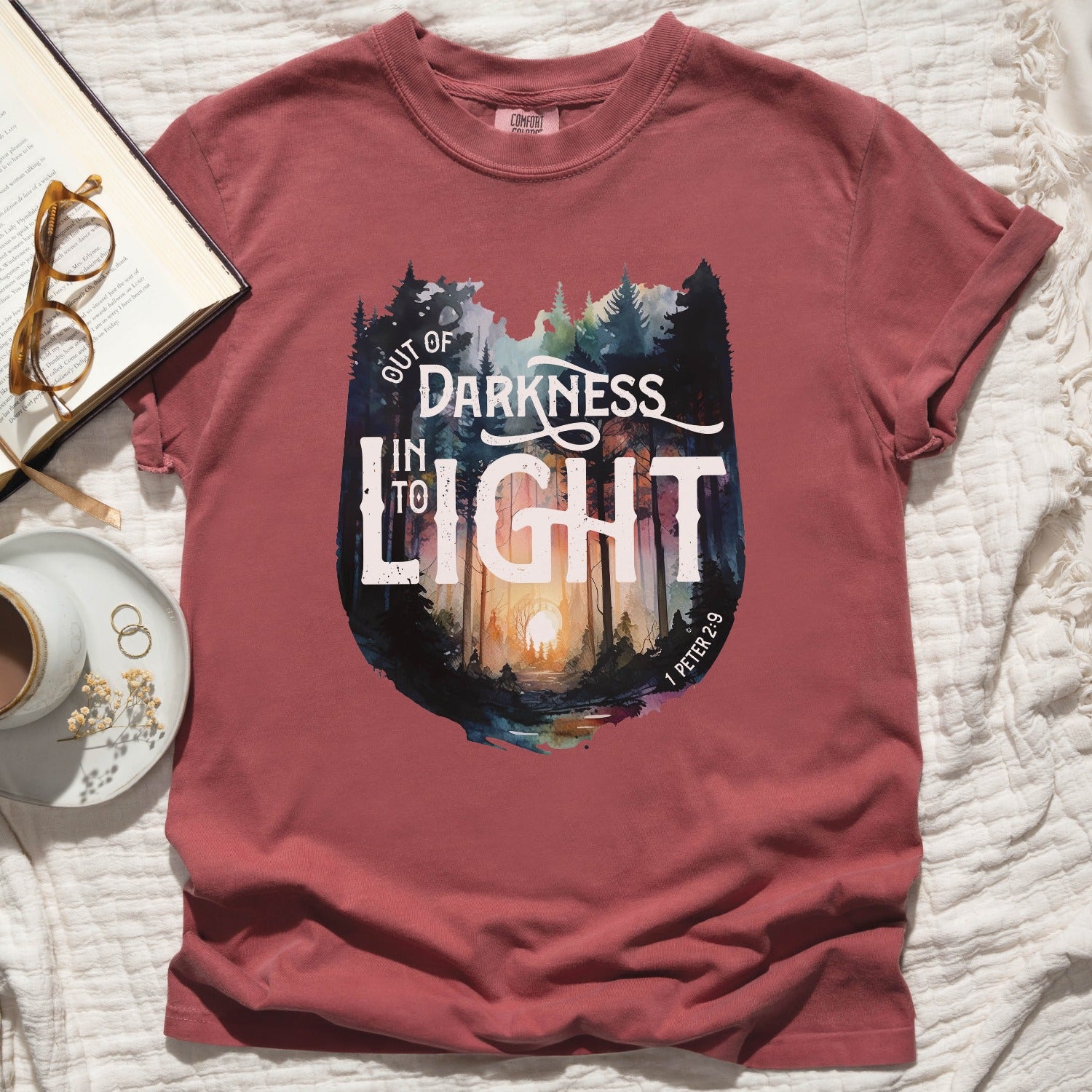 Elevate your Christian t-shirt collection with our unisex men's and women's Comfort Colors C1717 T-Shirt, featuring a watercolor forest design and the inspiring bible verse message "Out of Darkness, Into the Light - 1 Peter 2:9". Crafted for comfort in 100% ring-spun cotton, this heavyweight structured tee is super soft and breathable - choose from a range of trendy colors to suit your style. Wear your faith and effortlessly start a conversation that changes lives in this inspirational tee. Perfect thoughtful and meaningful gift for the faith-filled Jesus believer in your life. Let your light shine!