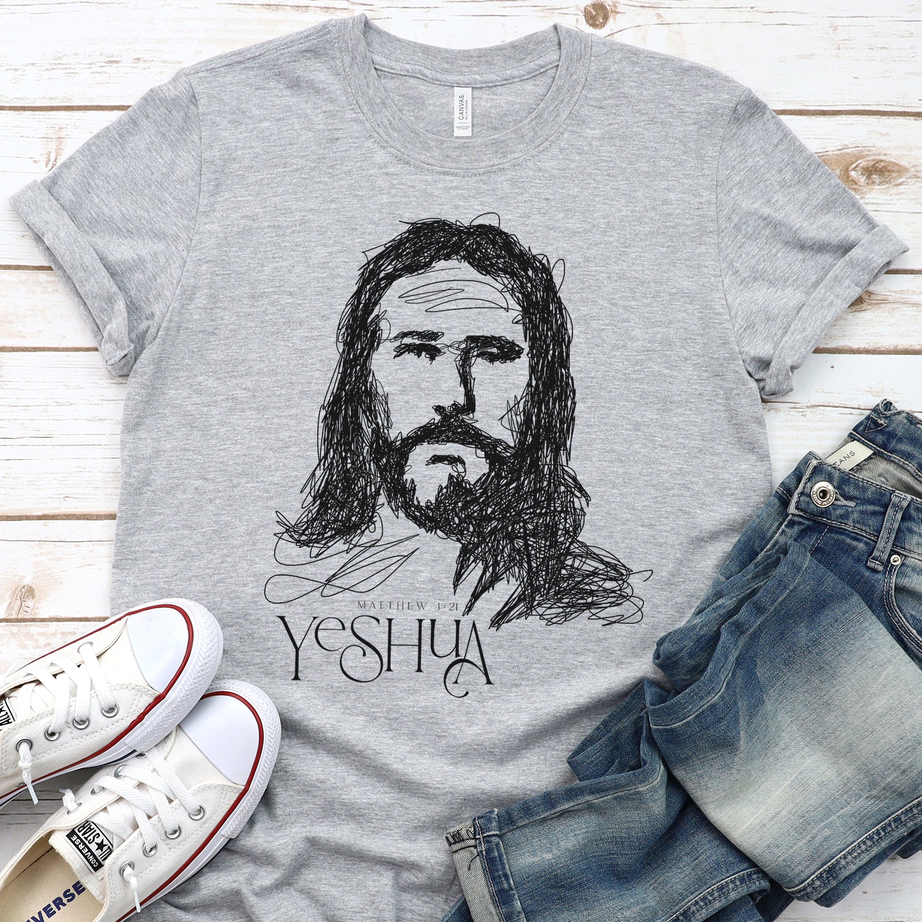 Introducing our Matthew 1:21 scripture "YESHUA" Christian men's & women's unisex t-shirt, featuring the face of Jesus portrait in a scribble style drawing design. Made in the USA with premium quality, they are super soft and comfortable - choose from 4 trendy colors to match your vibe. What a great way to share the message of salvation and love of God! Makes a meaningful gift for the worshiper, prayer warrior, and spirit-filled believer in your life!
